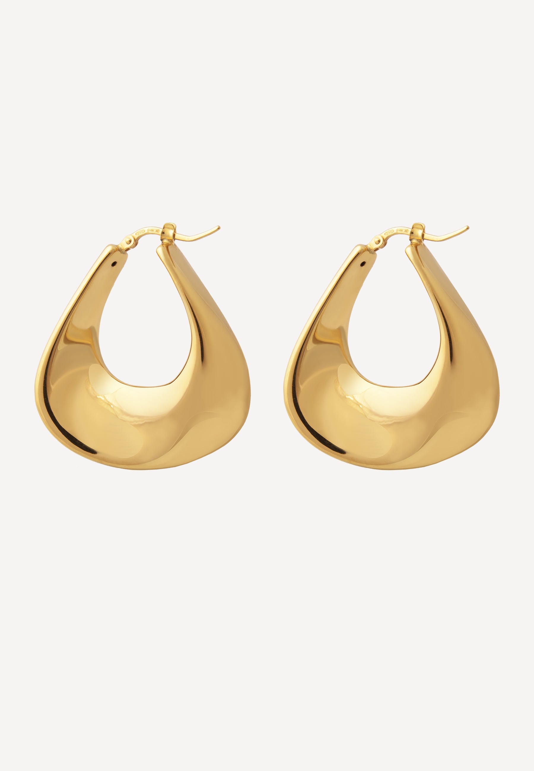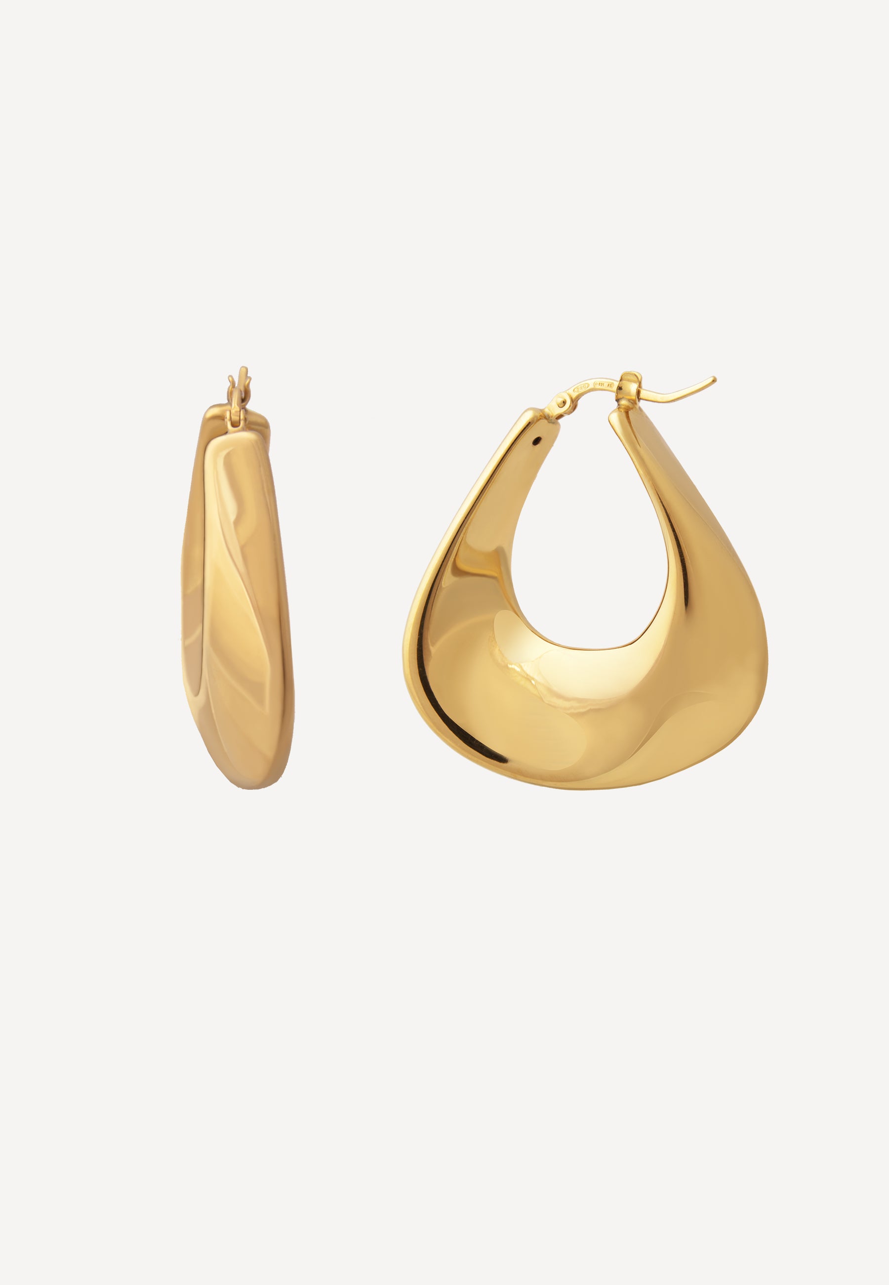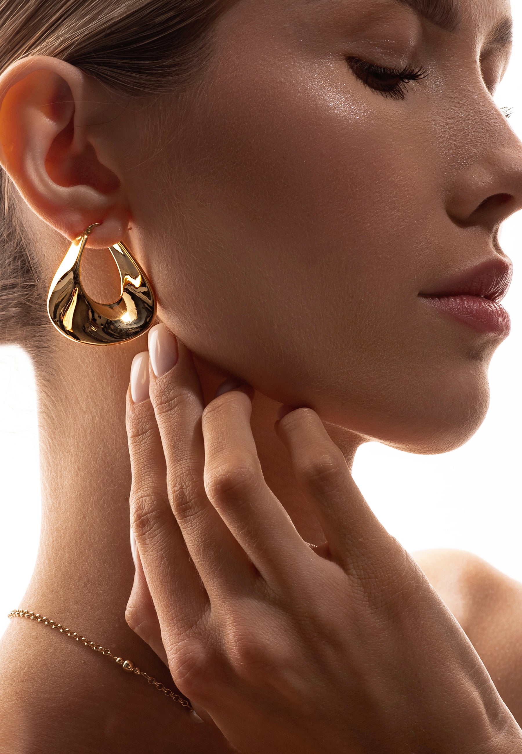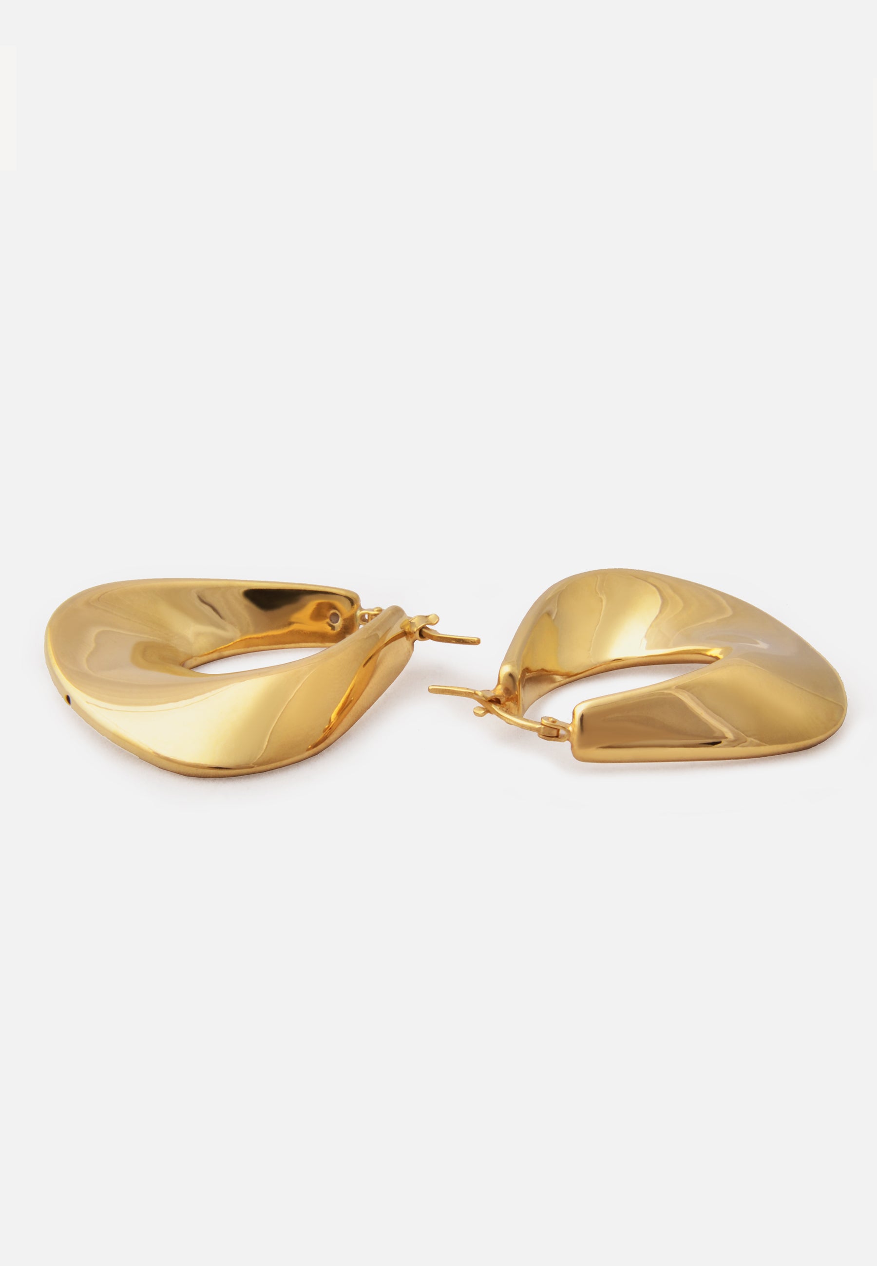 These sculptural earrings are crafted in a bold, modern shape, plated with a luxurious gold finish. With a smooth, fluid design that resembles a teardrop or abstract hoop, they add elegance and sophistication to any look. The high-shine finish reflects light beautifully, making them perfect for evening events or adding a touch of glam to everyday outfits.