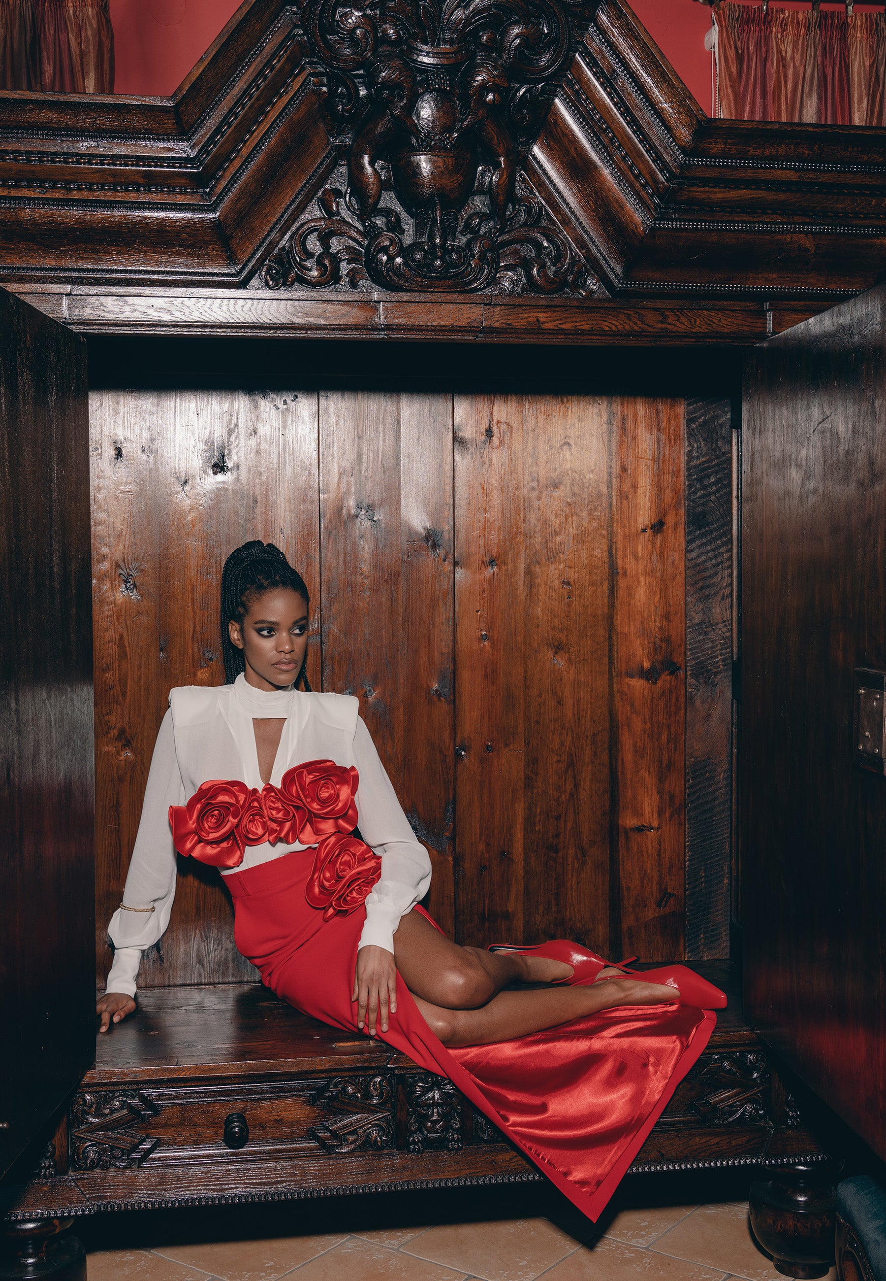 Adorned with hand-rolled sculptural roses that create a bold, romantic statement.
