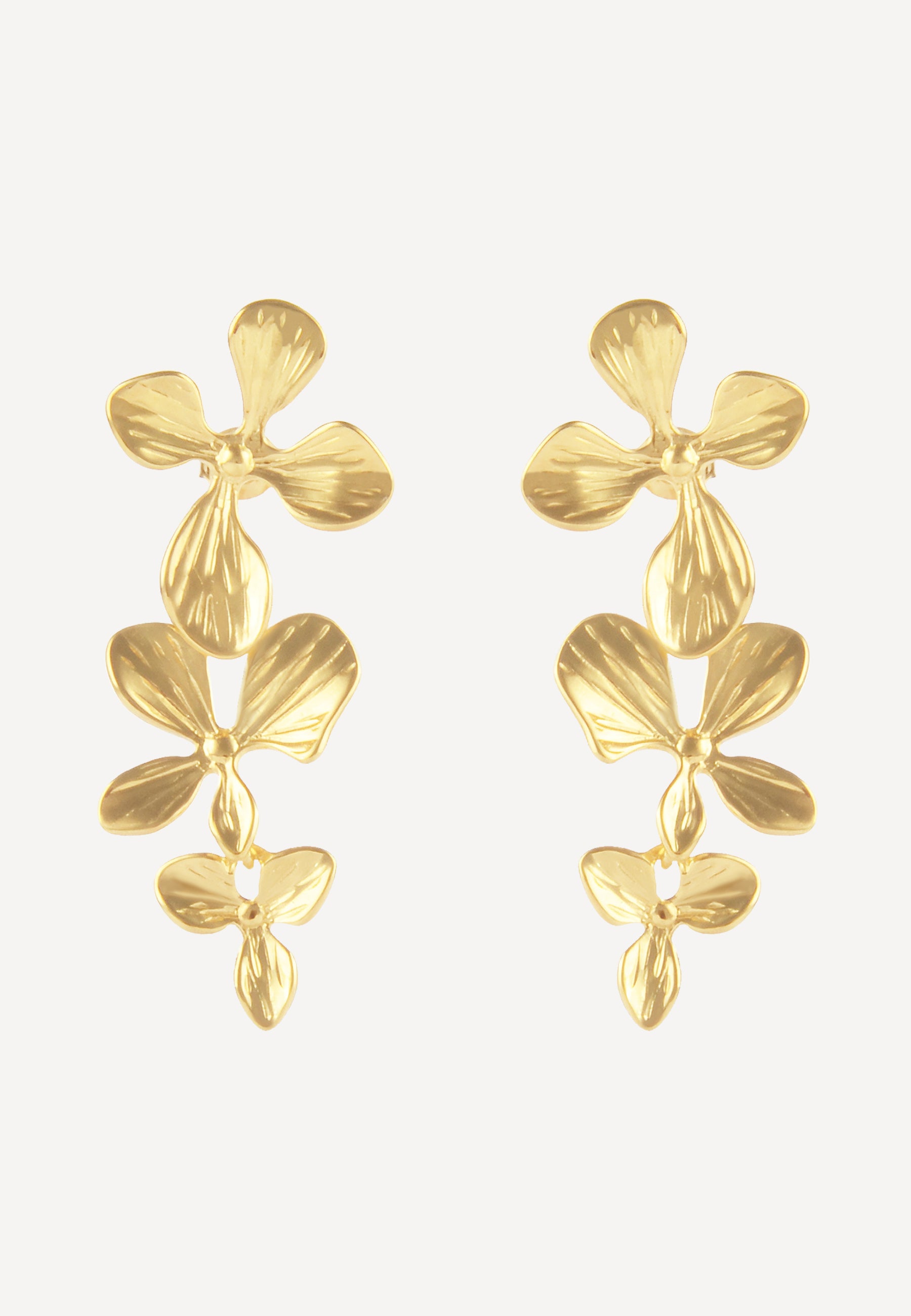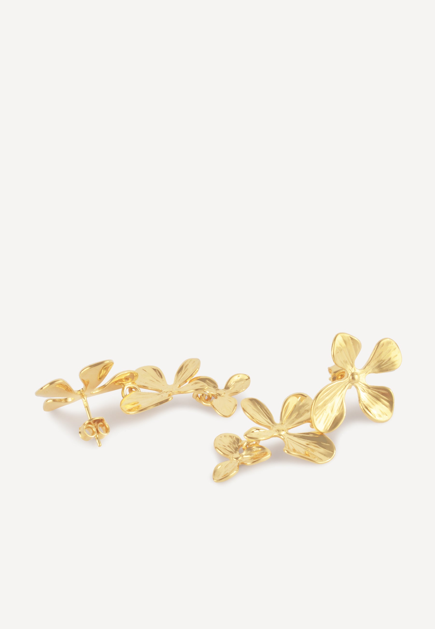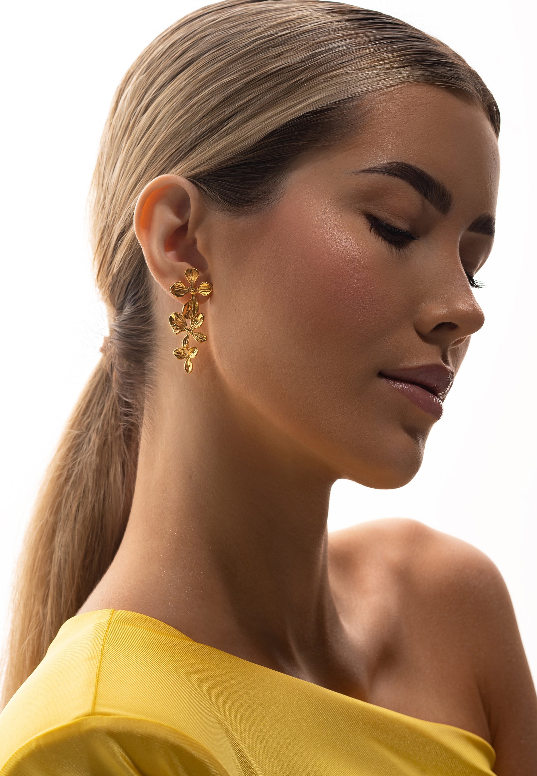 Elegant floral earrings crafted from sterling silver and finished with a luminous gold plating. Cascading blossoms create a graceful, elongated silhouette that softly follows the line of the neck.