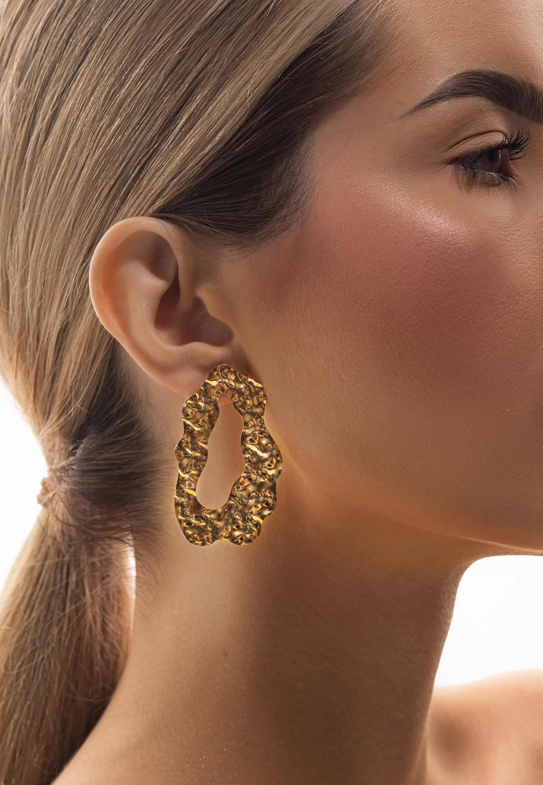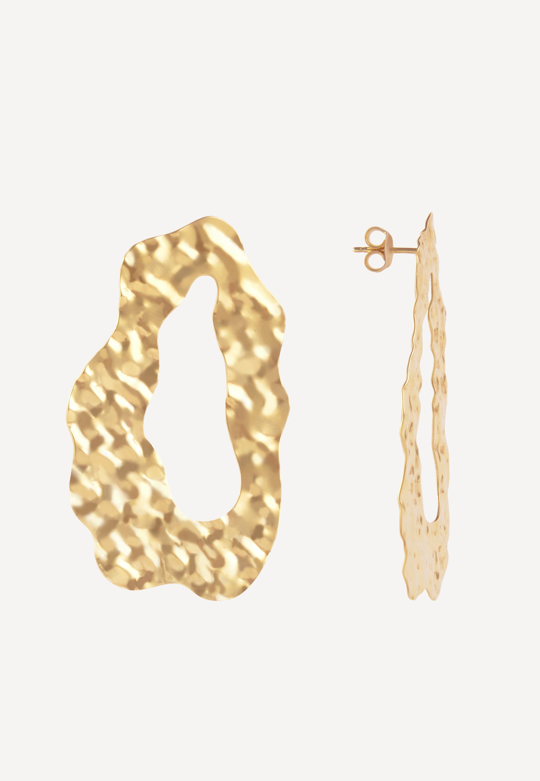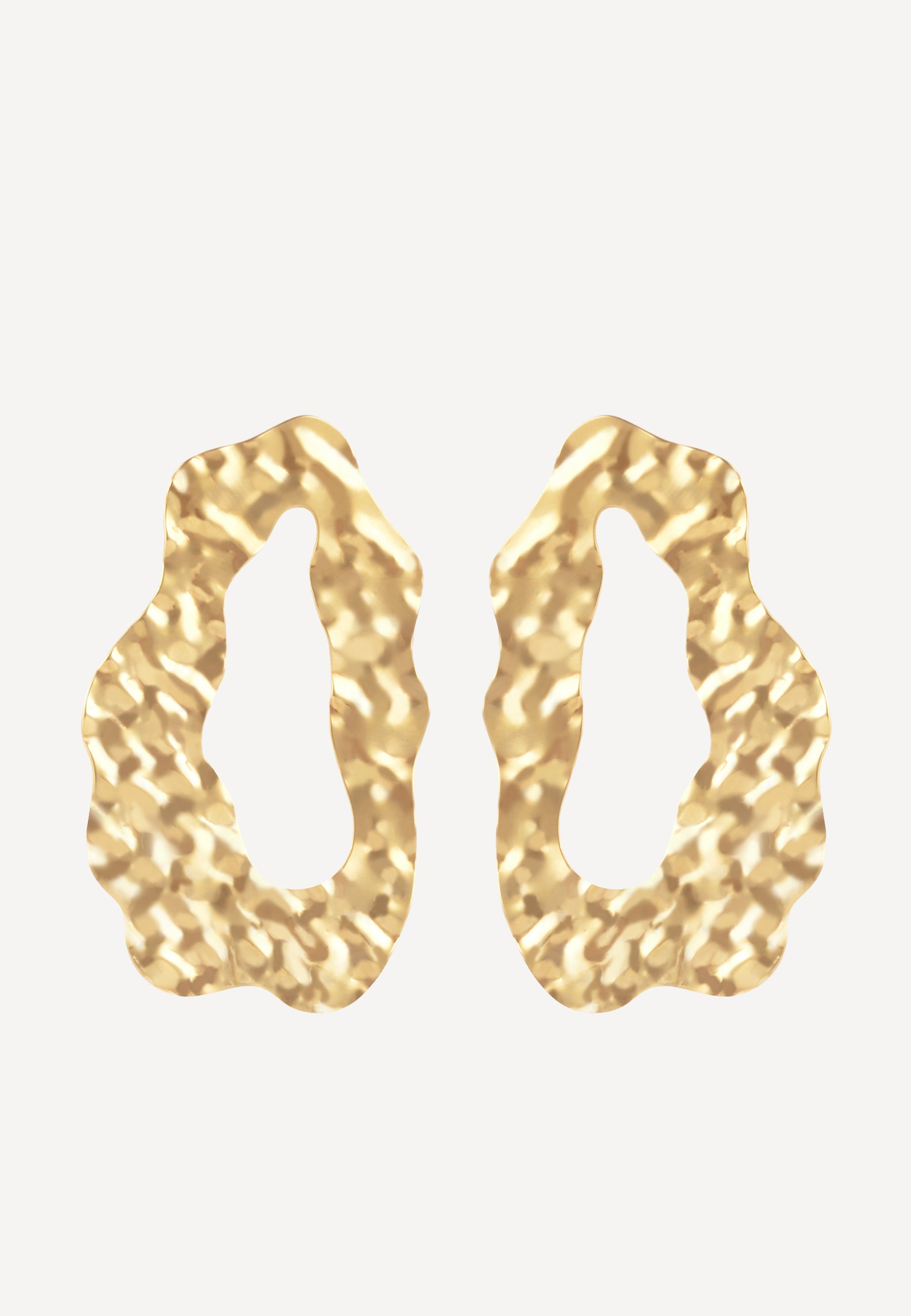 Sculptural statement earrings crafted from gold-plated brass. Their fluid, irregular silhouette evokes molten gold — organic, expressive, and boldly modern.